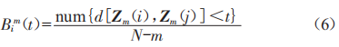 (3)設(shè)定相似容限1,統(tǒng)計向量Zm(i)和Zm(j)間距離小于1的個數(shù)與距離總數(shù)N-m的比值: