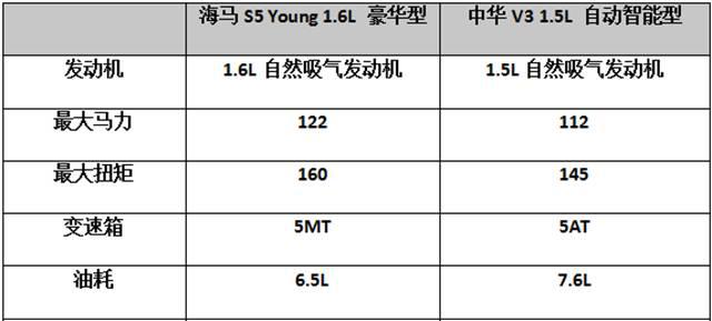 海馬S5 Young 1.6L 豪華型搭載1.6L發(fā)動(dòng)機(jī),最大功率122馬力,峰值扭矩160牛·米,匹配5速手動(dòng)變速箱,動(dòng)力酣暢;中華V3 1.5L 自動(dòng)智能型搭載的是一臺(tái)1.5L自然吸氣發(fā)動(dòng)機(jī),最大功率112馬力,峰值扭矩145?!っ?,匹配5AT變速箱。