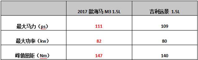 2017款海馬M3新車有1.5L+5MT、1.5L+CVT兩款動(dòng)力總成可供選擇,最大功率82kW(111PS),峰值扭矩147N·m,與遠(yuǎn)景1.5L車型相比,2017款海馬M3在最大馬力、最大功率和最大扭矩的參數(shù)對(duì)比上,都要優(yōu)于遠(yuǎn)景。