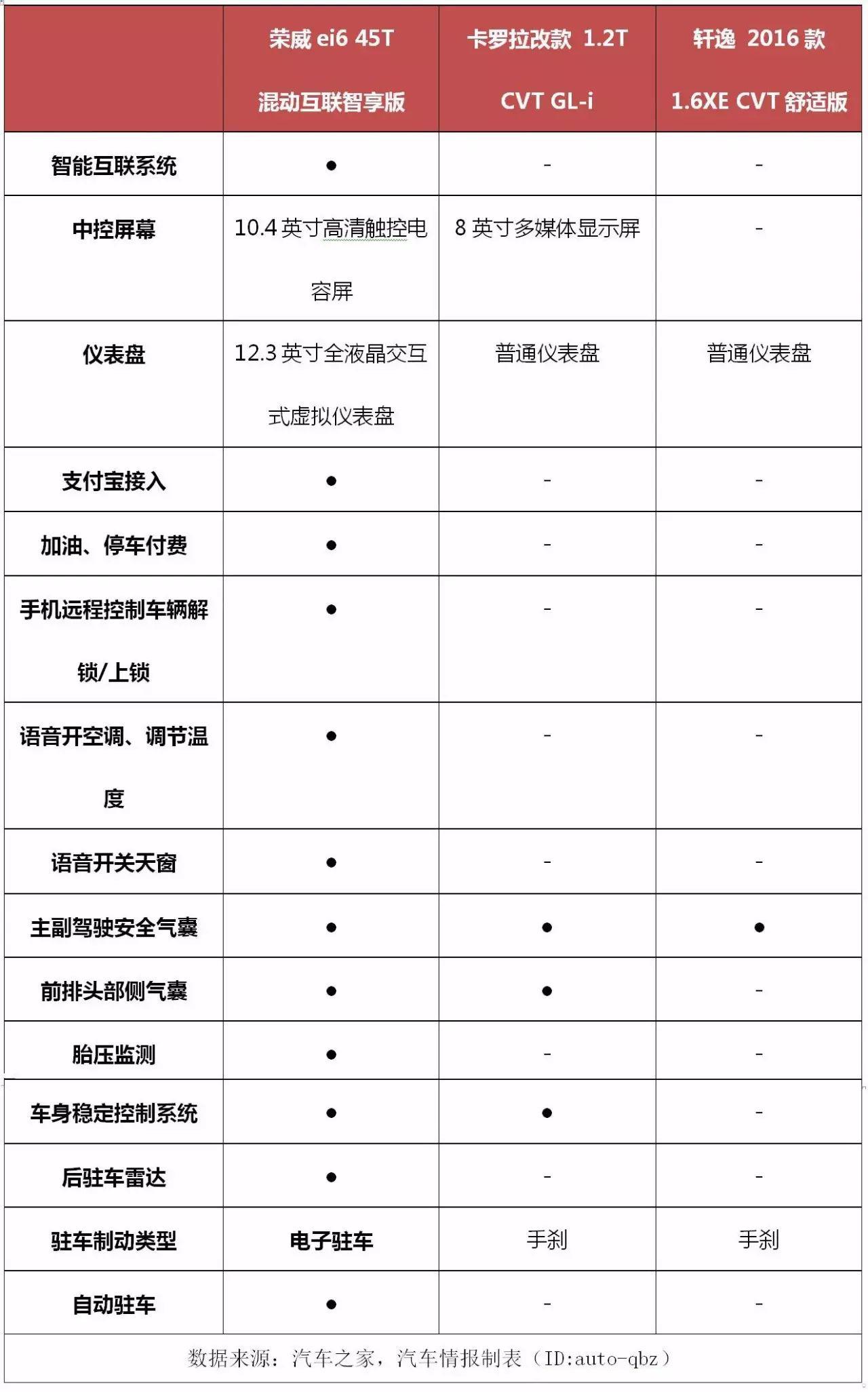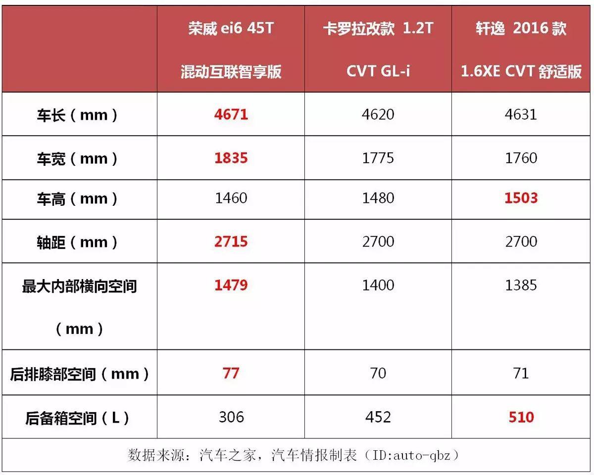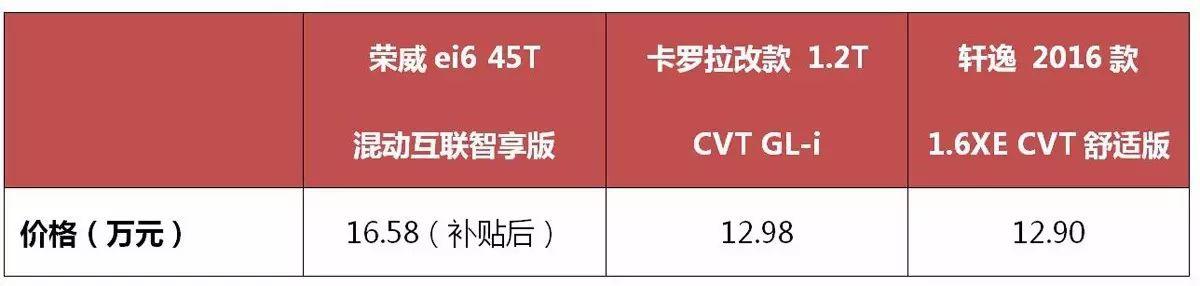 為了驗證它的真實力,我們找來了卡羅拉2017款改款1.2T CVT GL-i(以下簡稱卡羅拉)和軒逸 2016款1.6XE CVT舒適版(以下簡稱軒逸)這兩款合資車,來和榮威ei6 16T混動智享版(以下簡稱榮威ei6)做個對比,看看一代國貨精品是如何把合資車拍翻在沙灘上的。