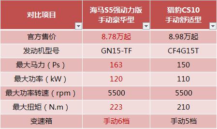 海馬S5強動力版搭載的1.5T渦輪增壓發(fā)動機,最大馬力163 Ps,最大扭矩223N·m,果不其然在動力數據方面完全秒殺獵豹CS10,總結起來就是一句話“馬力比你大、加速比你快、超車比你牛、檔位還比你多”,獵豹CS10幾乎被虐得體無完膚。