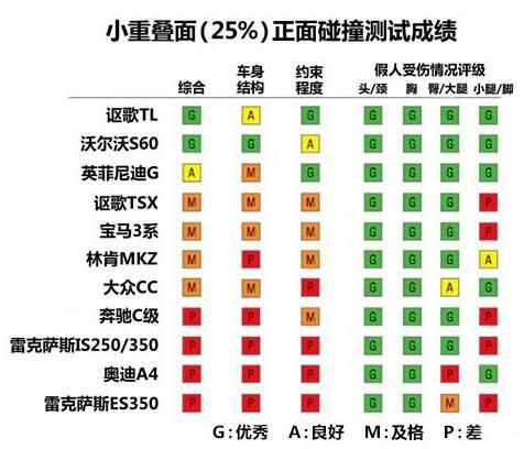 小重疊碰撞評價由車體結(jié)構(gòu)、假人傷害、約束系統(tǒng)評價三部分組成,評價等級由高到低為G(Good)、 A(Acceptable)、M(Marginal)、 P(Poor)四個級別,在第一次接受碰撞測試的11款美國在售的車型中,只有沃爾沃S60和謳歌TL獲得了“優(yōu)秀”的成績,其余車型均未取得如意結(jié)果。