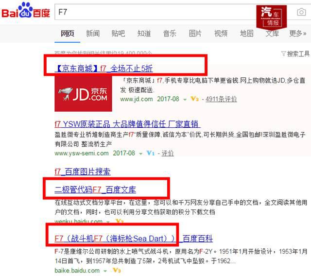 人類好奇的心理一旦打開,就一定要弄個(gè)明白,“F7”究竟是個(gè)什么鬼!人們開始像廣告中說的那樣在百度上搜“F7”,出來的結(jié)果,是京東商城F7活動、二極管代碼F7、鍵盤F7按鍵,甚至是戰(zhàn)斗機(jī)的型號F7!
