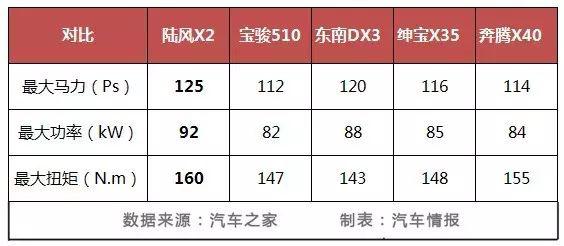 陸風(fēng)X2配備的1.6L自然吸氣發(fā)動(dòng)機(jī),最大功率125馬力,峰值扭矩160牛·米,小編選取了幾款小型SUV進(jìn)行對比,發(fā)現(xiàn)售價(jià)六七萬的寶駿510、紳寶x35、奔騰X40以及東南DX3的車型動(dòng)力都不及陸風(fēng)X2更強(qiáng)勁,簡直打遍天下無敵手。