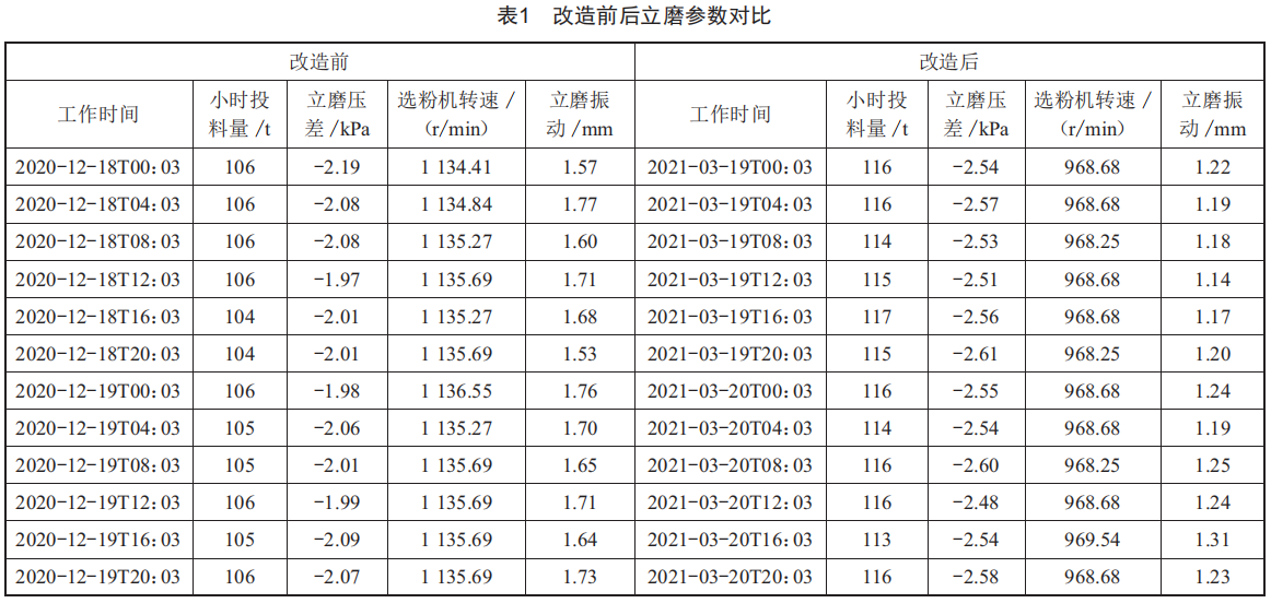 經(jīng)改造后,立磨投料量平均提高10t/h,磨內(nèi)壓差有所上升但在合理范圍內(nèi),因做功提高,產(chǎn)品質(zhì)量提升,選粉機(jī)轉(zhuǎn)速下降約150r/min,同時(shí)立磨振動(dòng)值下降,具體參數(shù)如表1所示。