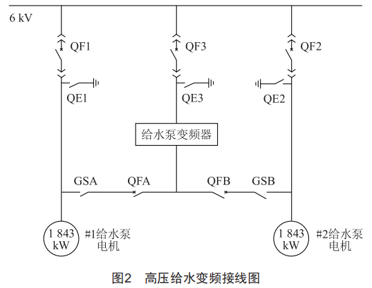 原設(shè)計(jì)高中壓給水泵一運(yùn)一備,兩臺高中壓給水泵電機(jī)分別由兩臺6kV開關(guān)供電。變頻改造采用"一拖二加旁路"方式,即一臺變頻器可分別拖動兩臺給水泵,設(shè)置一臺6kV開關(guān)單獨(dú)給高壓給水變頻器供電,變頻器輸出端分兩路分別引至高壓給水泵電源開關(guān)出線處,變頻接線如圖2所示。