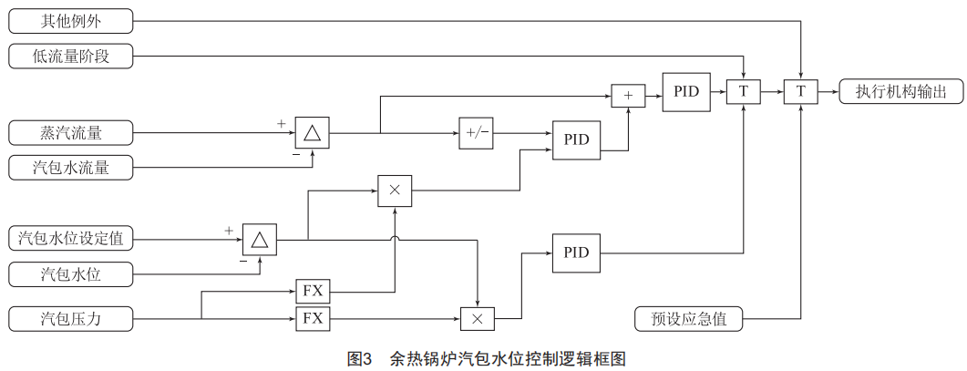 高中壓汽包水位控制采用的是汽包水位、蒸汽流量和給水流量組成的三沖量調(diào)節(jié),根據(jù)蒸汽流量高低分別采用單沖量調(diào)節(jié)和三沖量調(diào)節(jié)[3]??刂坪诵氖侨齻€比例積分器,單沖量調(diào)節(jié)單獨(dú)采用一個比例積分器,三沖量調(diào)節(jié)采用兩個比例積分器,單沖量調(diào)節(jié)時比例積分輸入為汽包水位偏差,三沖量調(diào)節(jié)則疊加了蒸汽流量與給水流量差值作為比例積分器輸入,控制輸出值即作為執(zhí)行機(jī)構(gòu)輸出??刂七壿嬁驁D如圖3所示。
