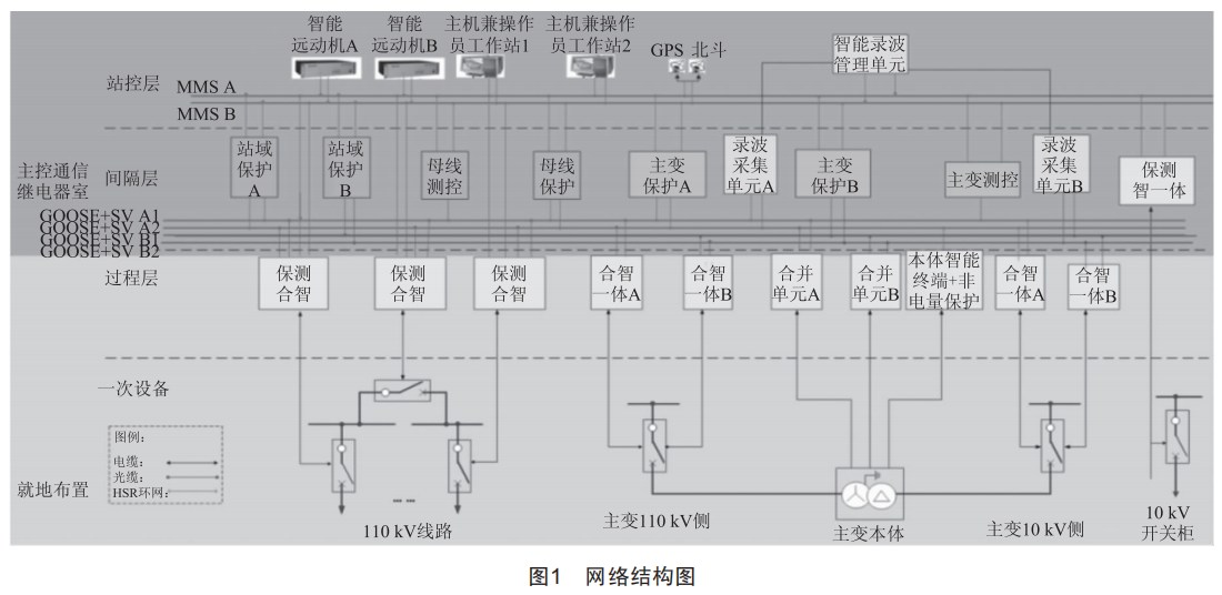 肇慶110kV港口變電站采用"三層兩網"網絡結構,三層分別為站控層、間隔層、過程層,兩網分別為站控層網絡、過程層網絡。站控層網絡采用雙星型冗余網絡結構,配置MMSA、MMSB網:過程層網絡G00SE網與SV網合并,采用雙星型冗余配置,使通信環(huán)節(jié)N-1故障不影響任何一套保護功能。間隔保護采用直采直跳,跨間隔保護如主變保護、母差保護,通過過程層G00SE+SV網絡采集電流、電壓、測量及控制信息,并通過G00SE網絡發(fā)出跳閘報文,實現(xiàn)網采網跳。