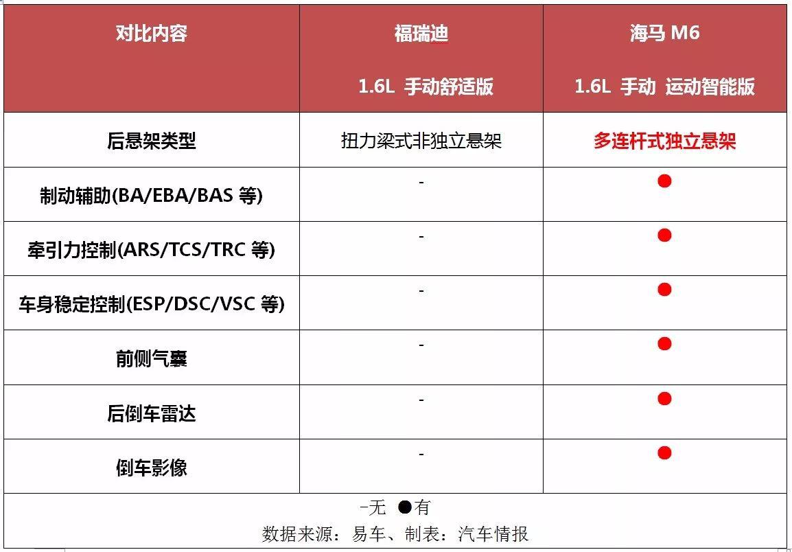 而在一些關(guān)鍵的主被動(dòng)安全配置上,海馬M6的優(yōu)勢(shì)一覽無余,無論是ESP、后獨(dú)立懸架、前側(cè)氣囊、后倒車?yán)走_(dá)以及倒車影像,福瑞迪全部缺席,誰更良心一看便知。
