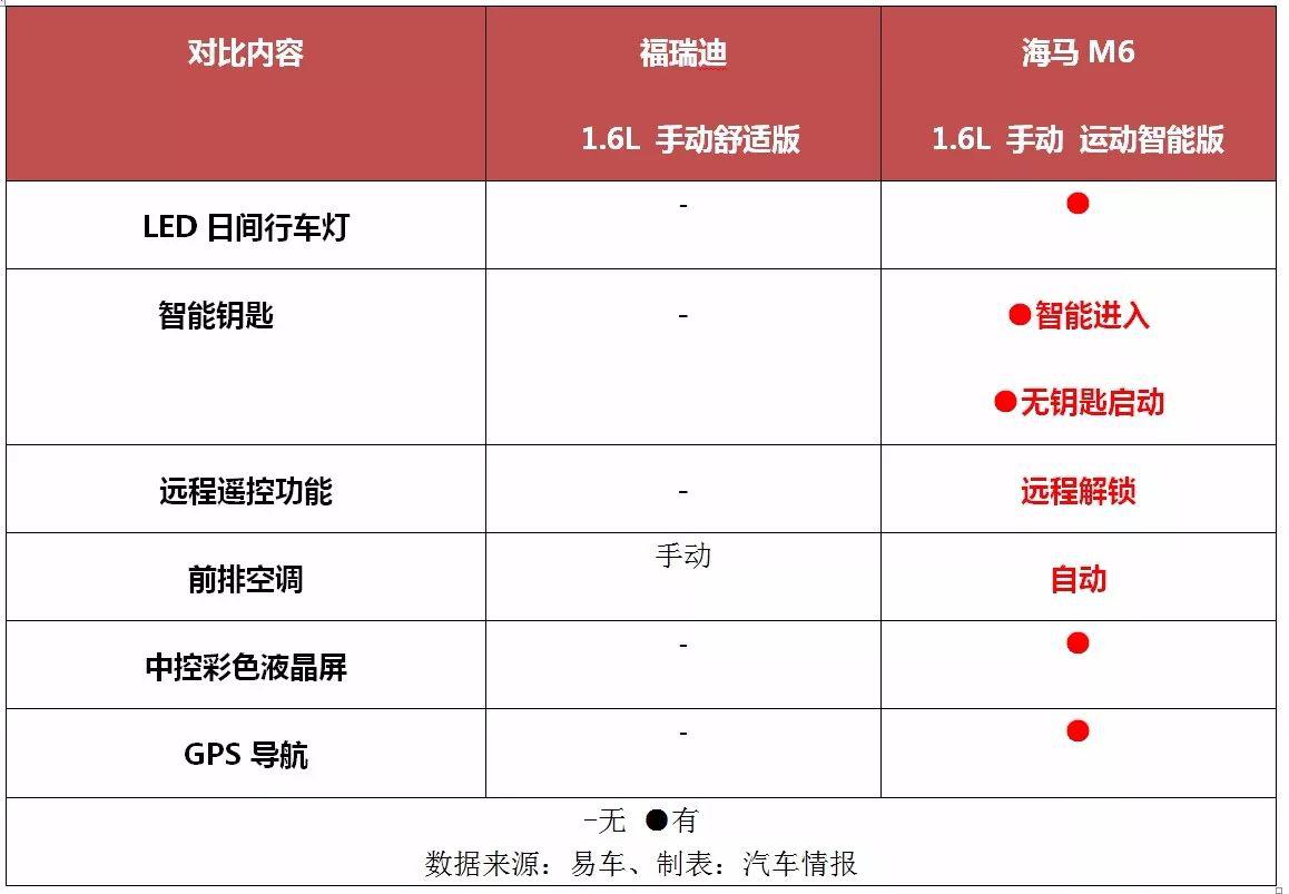 在此,我們不妨做一個(gè)簡(jiǎn)單的對(duì)比,來看看福瑞迪與其想要打敗的中國品牌車型之間究竟誰更“良心”。Ps:為了公平起見,我們選取了價(jià)格同樣為7.98萬元左右的福瑞迪1.6L 手動(dòng)舒適版(下文簡(jiǎn)稱福瑞迪)以及海馬M6 1.6L 手動(dòng)智能版(下文簡(jiǎn)稱海馬M6)。