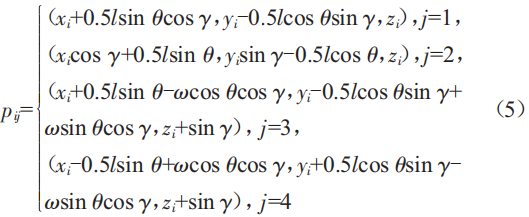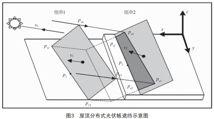 但在實際的工程項目中,不得不考慮光伏發(fā)電板的間距帶來遮擋問題的影響,假如光伏發(fā)電板的間距較大,使得前后光伏發(fā)電板互不遮擋,即太陽光過前排光伏陣列的頂點時投射在后排光伏陣列的最低點邊緣,此時雖然單塊的輻照度具備最大值,但在屋頂有限的面積內(nèi)光伏發(fā)電板前后的間距過大會導致屋頂排布的光伏發(fā)電板數(shù)量減少,其年平均發(fā)電量并不一定具有極大值:而前后間距過窄則會導致遮擋的部分陰影面積過大,單塊光伏組件發(fā)電效率低。因此要進一步考慮前后光伏發(fā)電板的遮擋問題,如圖3所示,第i塊光伏發(fā)電板下邊緣的中點坐標為p(xi,yi,:i),與第i+1塊光伏發(fā)電板遮擋部分的陰影的4個角坐標為: