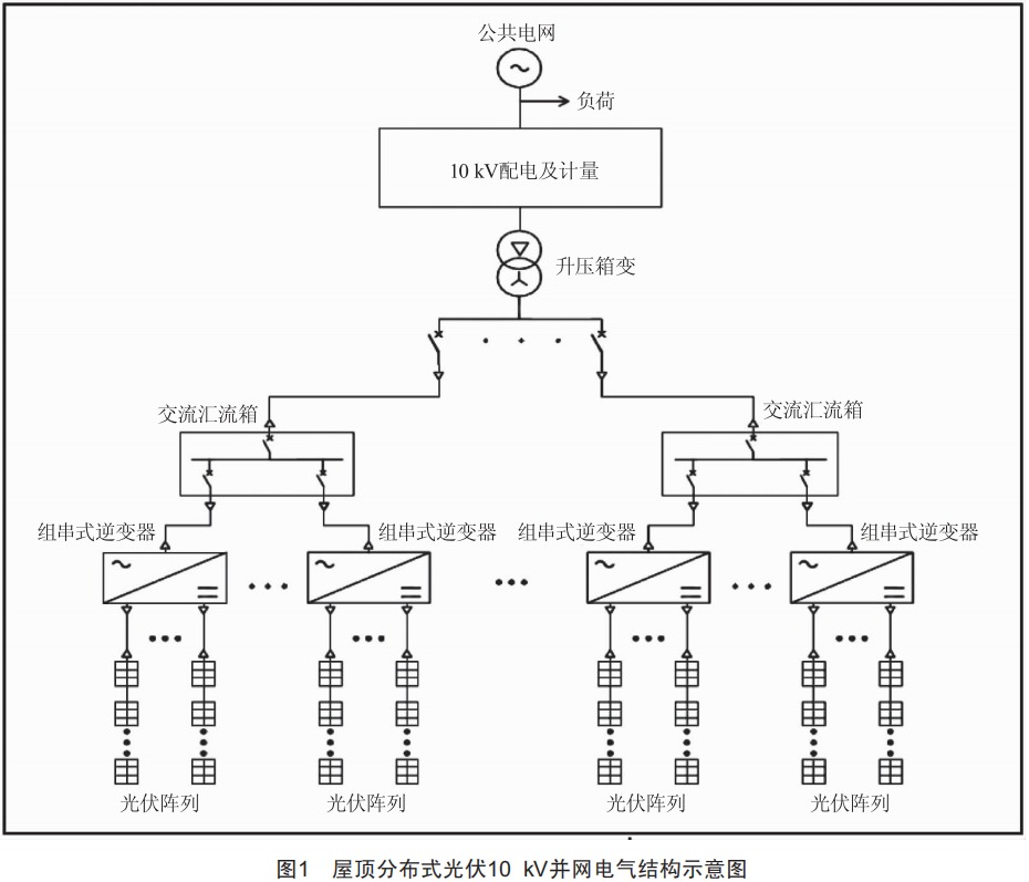 佛山市寶捷精密機械有限公司3.5MW屋頂分布式光伏發(fā)電項目位于廣東省佛山市三水區(qū)創(chuàng)新西路寶捷精密機械有限公司屋頂,地理位置:東經(jīng)112.998°,北緯23.239°,運行環(huán)境年平均氣溫21.9℃,年降水量1682.8mm,年平均日照1721.7h,項目安裝光伏組件最大標稱容量為3306.6kMp,采用275Wp多晶硅電池組件(1650mm×991mm×35mm)12024塊,安裝于廠區(qū)的廠房彩鋼瓦屋面上,彩鋼瓦屋面光伏組件沿屋面平鋪。10KV光伏并網(wǎng)系統(tǒng)由太陽能光伏組件、逆變器(共配置41臺70kM并網(wǎng)逆變器及2臺50kM并網(wǎng)逆變器)、匯流箱(10臺)、升壓變壓器(2臺1250kVA及1臺800kVA)、10KV并網(wǎng)柜、監(jiān)控系統(tǒng)等主要設(shè)備組成。光伏系統(tǒng)電氣結(jié)構(gòu)示意圖如圖1所示。