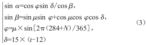 太陽方位角a和太陽高度角8可以由太陽赤緯角e和時間角s計算得出,其數(shù)學表達式為: