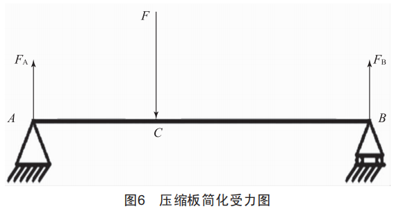 壓縮板材料為亞克力板,尺寸規(guī)格為230mm×230mm×5mm,在受力計算校核中將其視為一根橫梁,兩端固定在絲桿上,主要受到絲桿對其產(chǎn)生的力,壓縮板上下移動,將其簡化為一端固定、一端可移動的簡支梁模型來分析,如圖6所示。