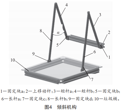 傾斜機構(gòu)如圖4所示,可移動四連桿機構(gòu)由上下移動桿、短桿、長桿和垃圾桶組合而成,隨著垃圾桶升起,由于垃圾桶自身和裝入其中的垃圾的重量,短桿與長桿所組成的a會逐漸變大,使垃圾桶傾斜。