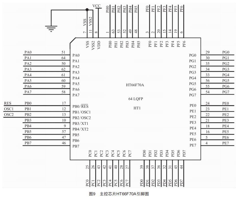 采用HT66F70A單片機作為整個系統(tǒng)的核心,控制垃圾桶的各項功能,使其獨立準確地完成各項工作。HT66F70A是HT66Fx0A系列的其中一款單片機,共有8組Io口,分別命名為PA、PB、…、PH,每組含有8個Io端口,用組名加上數(shù)字命名,從數(shù)字0開始,分別是PA0、PA1、…、PA7,其引腳圖如圖9所示,每個引腳都具有復(fù)用功能,編寫程序時應(yīng)對3個Io口的寄存器和引腳共用寄存器進行初始化設(shè)置。