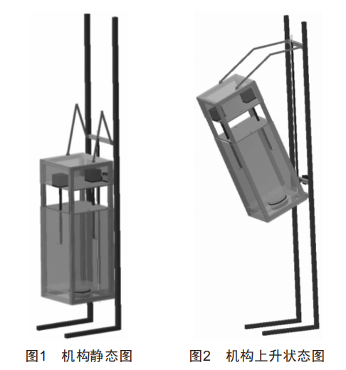 智能垃圾桶的機械結(jié)構(gòu)包括傾斜機構(gòu)、壓縮機構(gòu)和升降機構(gòu)等三部分,機構(gòu)的靜態(tài)和上升狀態(tài)分別如圖1、圖2所示。