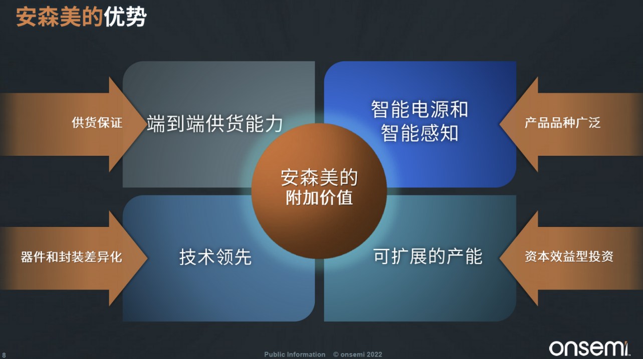 安森美的致勝組合由四點組成:首先是端到端供貨能力,為客戶提供供貨保障;第二是領(lǐng)先的技術(shù),為客戶提供能效、成本和重量俱佳的產(chǎn)品和方案;第三十智能電源和智能感知的產(chǎn)品陣容,這也是工業(yè)和汽車市場最為關(guān)鍵的產(chǎn)品需求;第四是通過資本效益型投資,突破產(chǎn)能障礙,實現(xiàn)可擴展的產(chǎn)能。