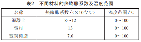 傳統(tǒng)工藝一方面需要考慮鋼板的焊接變形,另一方面需要考慮鋼材、混凝土、玻璃樹脂之間的膨脹系數(shù),不同材料的熱膨脹系數(shù)及溫度范圍數(shù)據(jù)如表2所示。從表中可以發(fā)現(xiàn),鋼材和玻璃樹脂的熱膨脹系數(shù)相差很大,兩種材料的界面處存在應(yīng)力釋放引入的缺陷。鋼材的焊接變形可以通過選擇合適的焊接鋼材厚度、焊接順序和焊接工藝解決,而鋼材和玻璃樹脂之間的熱失配問題目前無法找到合適方法去解決。
