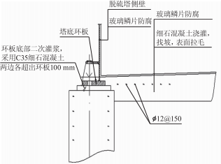 脫硫塔混凝土基礎(chǔ)通常采用℃25鋼筋混凝土進(jìn)行一次灌漿,根據(jù)建設(shè)區(qū)域的地質(zhì)情況、50年最大風(fēng)力情況、50年最大降雨情況以及地震要求等環(huán)境因素,一次混凝土澆筑到相對(duì)脫硫塔底板下約0.3m處,接著制作安裝脫硫塔底部的基礎(chǔ)環(huán)板,基礎(chǔ)環(huán)板采用鋼筋和模板固定,完成后進(jìn)行脫硫塔壁板的安裝,通過調(diào)整墊鐵來調(diào)平脫硫塔的安裝面,保證脫硫塔的垂直度。在脫硫塔整體安裝完成并驗(yàn)收合格后進(jìn)行二次灌漿,采用無收縮的水泥砂漿灌注到脫硫塔底部上沿0.04m處,將鋼筋和脫硫塔底板搭接焊接,脫硫塔中間與脫硫塔壁面呈0.003o坡度,以保證漿液能順利從排空口排出。二次灌漿結(jié)束后,需要根據(jù)現(xiàn)場(chǎng)的環(huán)境情況對(duì)二次灌漿區(qū)域進(jìn)行養(yǎng)護(hù)。待混凝土徹底凝固后進(jìn)行下一步工序,即采用噴砂機(jī)對(duì)脫硫塔底部的混凝土進(jìn)行打毛,使其達(dá)到一定的粗糙度,便于涂刷玻璃樹脂,涂刷工作嚴(yán)格按照如下工序進(jìn)行:表面凈化二清理表面粉塵二涂刷底涂第一道二干燥二涂刷底涂找補(bǔ)漏點(diǎn)二乙烯基樹脂和膠泥按比例混合二準(zhǔn)備玻纖布多層二用樹脂膠泥玻纖布貼襯二達(dá)到要求厚度干燥二清理表面涂裝面漆二加耐磨層二電火花檢查二最終檢查二驗(yàn)收。