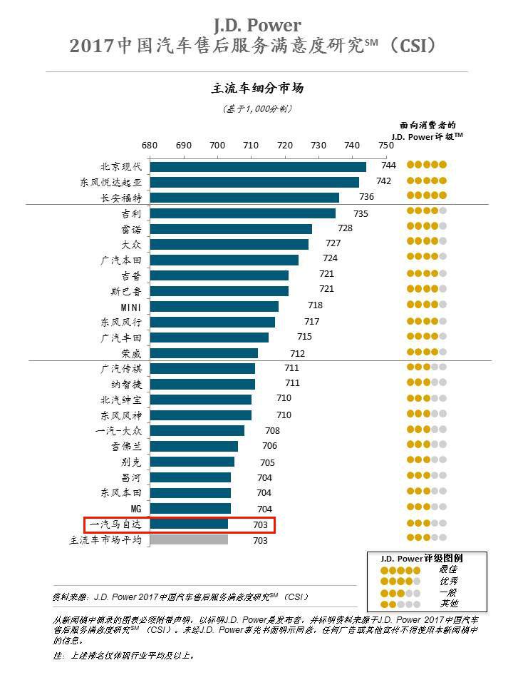 今年,一汽馬自達阿特茲“黑斑”事件發(fā)酵,CX-4發(fā)動機漏油、變速箱脫擋與異響等問題被持續(xù)投訴。產品質量一般、售后服務差成了一汽馬自達的痛處,在J.D.Power發(fā)布的“2017年中國售后服務滿意度(CSI)調查”中,一汽馬自達以703分和三星的評級,位居榜單倒數第1位。