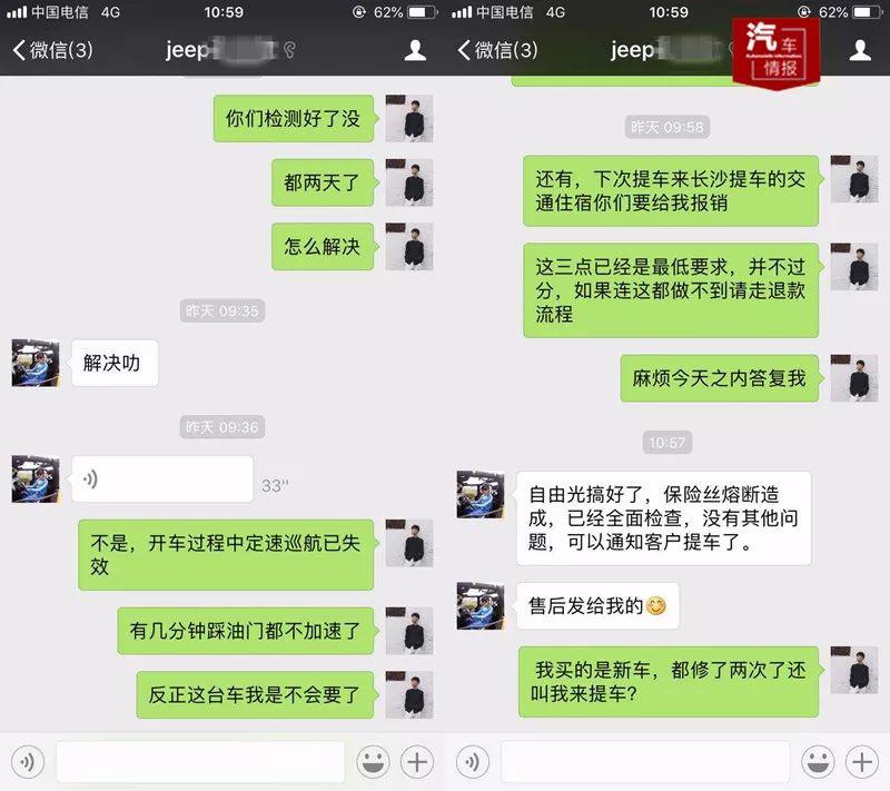 隨后,汽車情新媒體又電話采訪了湖南新城Jeep4S店的售后人員郭經(jīng)理,郭經(jīng)理表示,唐先生的車輛的確不符合退換車的標準,即使是走廠家流程也會給出同樣的答復(fù)?!耙驗椴环蠂胰ㄒ?guī)定,所以退換車肯定是不現(xiàn)實的,但我們作為經(jīng)銷商肯定還是本著盡量讓客戶滿意的出發(fā)點解決問題,一切都是可以坐下來談的,但是唐先生執(zhí)意要求退換車,達不到就要鬧到網(wǎng)上去,我們也很無奈?!惫?jīng)理表示。