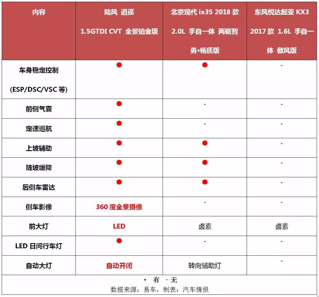 不過,當(dāng)陸風(fēng)逍遙出現(xiàn)的時(shí)候,上述情況或許要重新斟酌了。從下方舒適科技配置對(duì)比來看,陸風(fēng)逍遙的優(yōu)勢(shì)十分明顯,基本上做到了全面覆蓋,該有的配置一個(gè)不落,值得稱贊。相比較而言,ix35和KX3要遜色不少,除了一些常見的電動(dòng)后視鏡調(diào)節(jié)、手動(dòng)空調(diào)、織物座椅等配置外,其他的如中控彩色大屏、語音控制、全景天窗、多功能方向盤、等等都沒有提供。