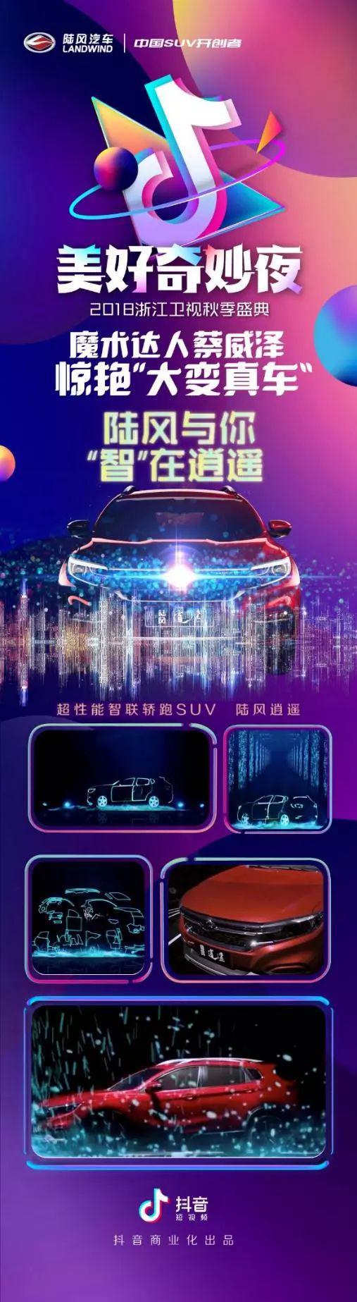10月19日,我還記得那是個周五,下班后窩在沙發(fā)里百無聊賴的準(zhǔn)備看會電視打發(fā)時間,當(dāng)換到浙江衛(wèi)視時,卻被一場名為“抖音美好奇妙夜2018浙江衛(wèi)視秋季盛典”的晚會給吸引了。不為別的,起初就是因為“抖音”二字。但在魔術(shù)表演環(huán)節(jié),一輛陸風(fēng)逍遙突然憑空出現(xiàn)在舞臺中心,這讓不少人都著實有些驚訝,疑惑到底是怎么做到的?再搭配上炫麗的舞臺效果,讓陸風(fēng)逍遙再次成為了全場矚目的焦點。就在那一刻,它的營銷成功了。
