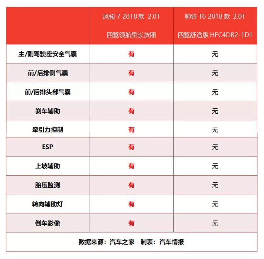 如主副駕駛安全氣囊、剎車輔助、ESP車身穩(wěn)定系統(tǒng)等在內(nèi)的基礎(chǔ)配置,帥鈴T6都出乎意料的沒有裝備。難以想象,一款售價近12萬元的皮卡車型,居然還是0安全氣囊,實事求是的講,這無疑讓消費者手心捏了一把汗。而之于風(fēng)駿7,則一個不落的全部裝備,于此,更能看出誰是在用心造車。