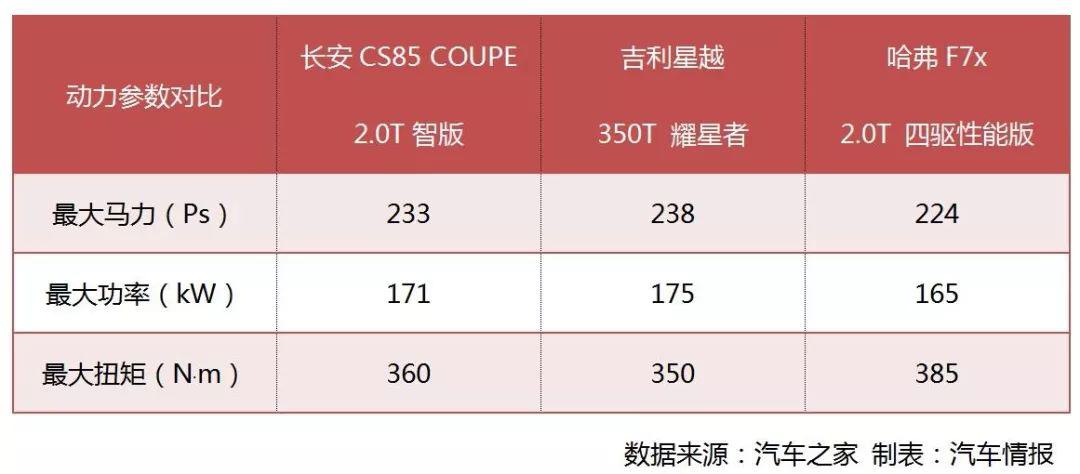 就以今天的主角CS85 COUPE搭載的這臺藍鯨D20TGDI直噴增壓發(fā)動機來說吧,它與之匹配的是愛信的8AT變速箱。最大功率171kW,最大扭矩360N·m,官方實測的零百加速時間為7.5S,從數(shù)據(jù)上來看,這臺發(fā)動機的參數(shù)也已經(jīng)超過了當(dāng)年3.0L甚至3.5L的自然吸氣發(fā)動機。 你認(rèn)為拿以前的大排量發(fā)動機對比沒意義?也沒關(guān)系,那我們就找個和CS85 COUPE問世時間相近的車型吧。就以吉利的星越和哈弗的F7x來說,我們可以通過下方的表格很直觀的看出。在參數(shù)方面,三者雖然各有特點,但CS85 COUPE屬于各項表現(xiàn)最均衡的一位。