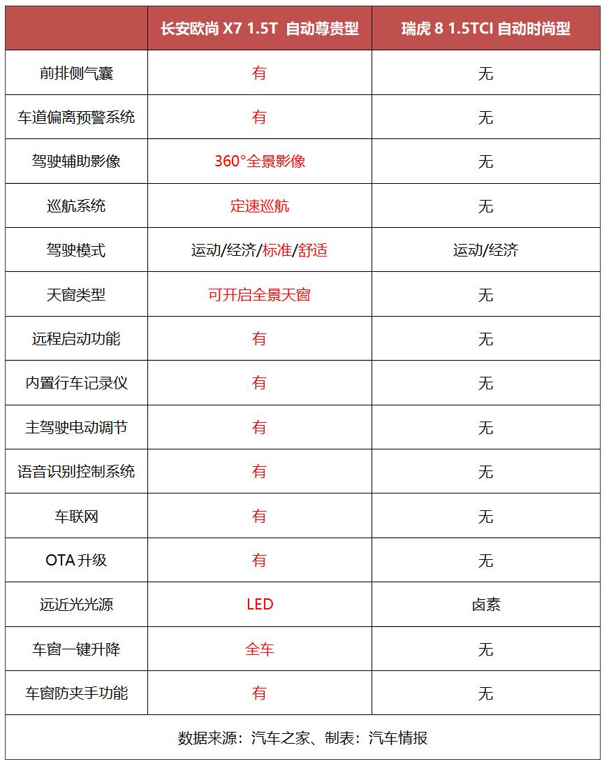 如下表所示,在二者價格幾乎一致的情況下,長安歐尚X7比瑞虎8多出了包括前排側(cè)氣囊、車道偏離預(yù)警系統(tǒng)、360°全景影像、定速巡航、四種駕駛模式、可開啟全景天窗、遠(yuǎn)程啟動、語音識別、車聯(lián)網(wǎng)、內(nèi)置行車記錄儀等一系列主被動安全及實(shí)用舒適配置,明顯更具誠意。而對于瑞虎8而言,想要得到上述配置,得把價格拉到15.59萬元的自動旗艦型。毋庸置疑,對于務(wù)實(shí)的消費(fèi)者來說,這多出的5萬多元可不是一筆小預(yù)算。