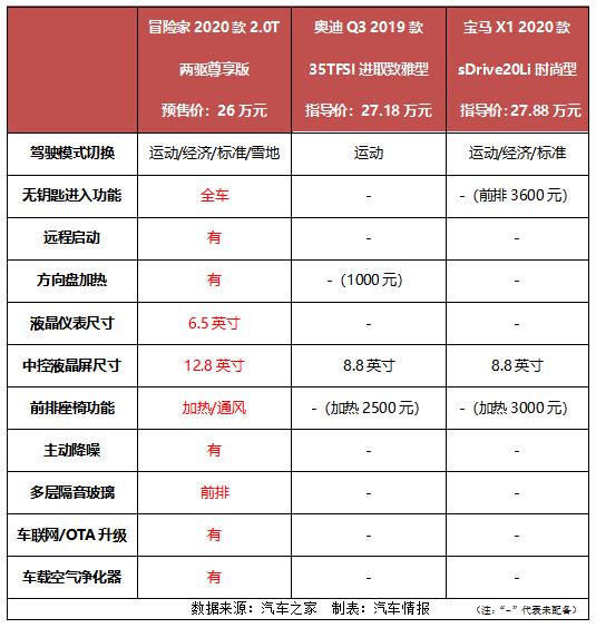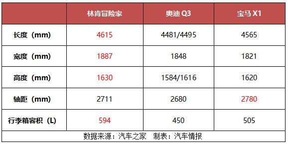 就拿售價同在26萬元上下的奧迪Q3 2019款35TFSI進取致雅型(下稱奧迪Q3)、寶馬X1 2020款sDrive20Li 時尚型(下稱寶馬X1)和冒險家2020款2.0T兩驅尊享版(下稱林肯冒險家)進行比較,結果自然是一目了然。