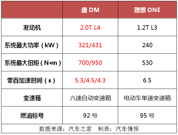 從二者的動力對比表中能看到,唐DM在功率、扭矩等方面實現(xiàn)全面領(lǐng)先,不足5秒破百的表現(xiàn),足以令它挑戰(zhàn)百萬元以下的燃油跑車。相較而言,理想ONE的動力雖說在30萬級燃油車市場中尚算中上,但若放到新能源陣營里,此種表現(xiàn)僅能算是中規(guī)中矩。值得注意的是,因為三缸發(fā)動機(jī)、燃油標(biāo)號為95號油,理想ONE在平穩(wěn)性、經(jīng)濟(jì)性等方面被部分車主所詬病,相對而言,唐DM則能省去不少后顧之憂。