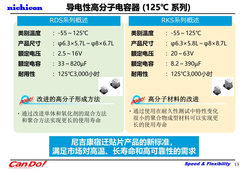 尼吉康宿遷工廠生產(chǎn)的RKS、RDS系列兩款產(chǎn)品,同樣具有更長使用壽命的優(yōu)點。據(jù)了解,這兩個系列產(chǎn)品的溫度范圍在與以往的105℃“RPS系列”和“RSS系列”保持同等特性的同時,還升級了耐高溫度和耐久性,實現(xiàn)了行業(yè)最高水平的125℃、3000小時的耐久性和高耐濕性。