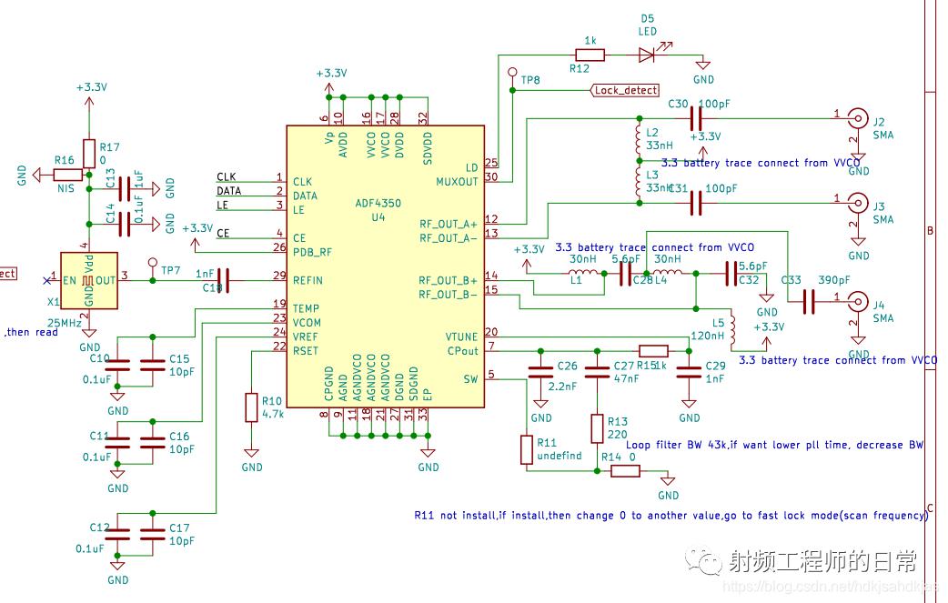 分享一個以前調試的ADF4350設計筆記,可輸出0dB本振信號。網上有很多成功的設計案例,但是調試的時候會遇到很多其他問題,所以只能在設計的時候考慮全面。ADF4350具有一個集成電壓控制振蕩器(VCO),其基波輸出頻率范圍為2200-4400MHz。此外,利用1/2/4/8/16分頻電路,用戶可以產生低至137.5 MHz的RF輸出頻率。對于要求隔離的應用,RF輸出級可以實現(xiàn)靜音。靜音功能既可以通過引腳控制,也可以通過軟件控制。同時提供輔助RF輸出,且不用時可以關斷。