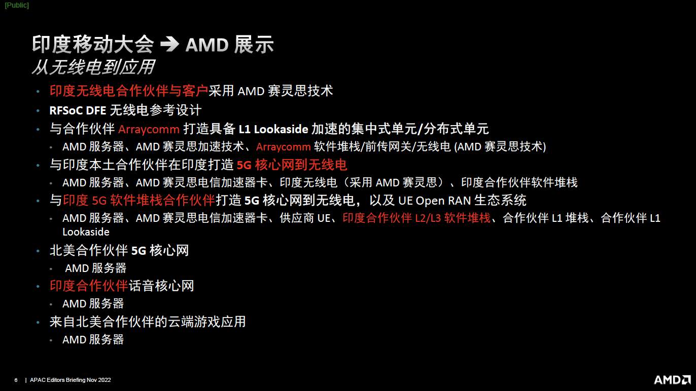 · 印度移動(dòng)大會(huì)上,AMD展示了與印度兩個(gè)合作伙伴的合作案例,以及三個(gè)無(wú)線電到核心網(wǎng)的端到端展示。