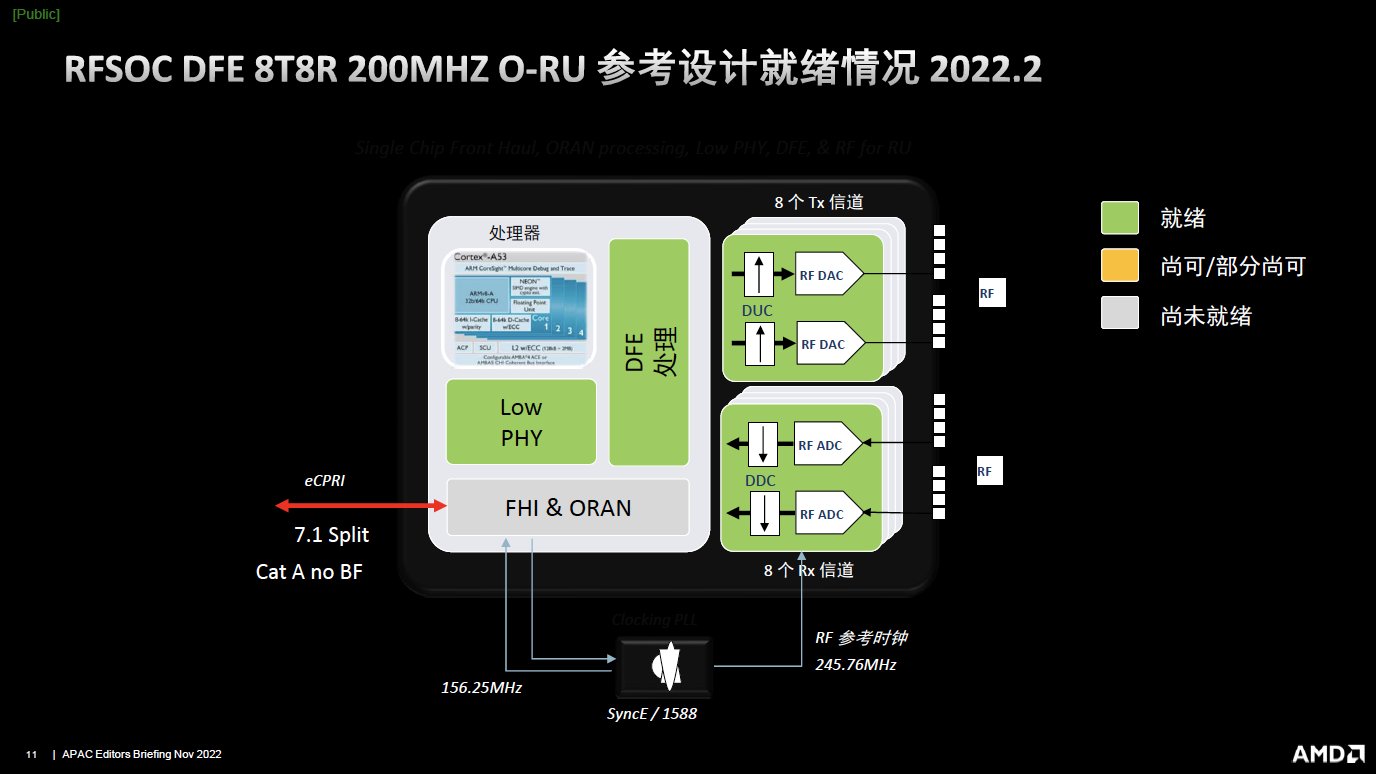 據(jù)Gilles Garcia介紹,通過(guò)一個(gè)RFSoC器件,就可以實(shí)現(xiàn)一個(gè)滿足8T8R 200兆赫的方案。這是一個(gè)前傳和RAN的接口,可以實(shí)現(xiàn)Low PHY進(jìn)行DFE的處理。該參考設(shè)計(jì)正在開(kāi)發(fā)過(guò)程中,預(yù)計(jì)將在2023年1月問(wèn)世。主要是FHI和ORAN的部分尚未就緒,還處于開(kāi)發(fā)的階段。