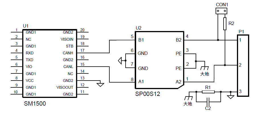 一般的CAN收發(fā)器芯片ESD、浪涌防護等級較低,如SM1500隔離CAN收發(fā)器雖隔離耐壓為3500VDC,裸機情況下,CAN接口ESD可達6kV,但無法滿足常見的浪涌測試要求。工業(yè)產(chǎn)品對通信接口的EMC等級要求較高,許多應用要求滿足IEC61000-4-2靜電放電4級,IEC61000-4-5 浪涌抗擾4級等要求,在此情況下,必需增加必要的保護電路,才能滿足要求。
