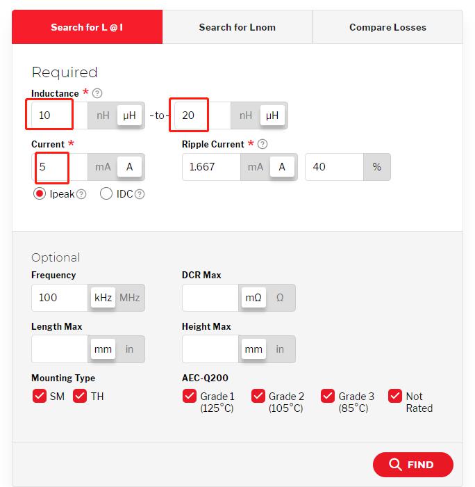 可以看到計算器工具提供了2種搜索方法,一種是基于工作電流的,還有一種是基于感值的,選擇第一種試試看,感值范圍10uH-20uH,電流5A,紋波系數(shù)默認40%,開關(guān)頻率可選100kHz(為了后面的交流損耗計算,需要提供頻率)。