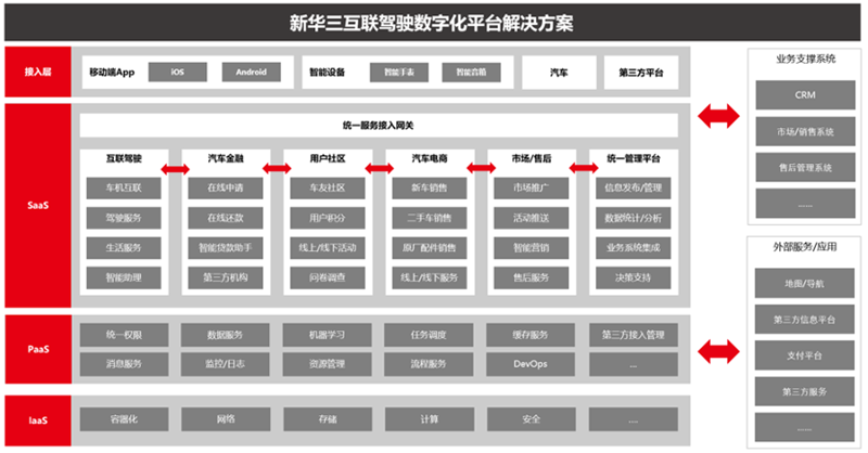 以新華三為某頭部車企提供的云平臺(tái)為例,該車企的互聯(lián)駕駛平臺(tái)需要通過(guò)云平臺(tái),提供全球統(tǒng)一共享的數(shù)字化云服務(wù)。PaaS層需基于物聯(lián)網(wǎng)、大數(shù)據(jù)分析、AI、機(jī)器學(xué)習(xí)等技術(shù),為SaaS層提供統(tǒng)一的計(jì)算能力和服務(wù)能力。在業(yè)務(wù)支撐能力上,則需要以模塊化方式快速構(gòu)建支持按需定制的數(shù)字化出行解決方案。