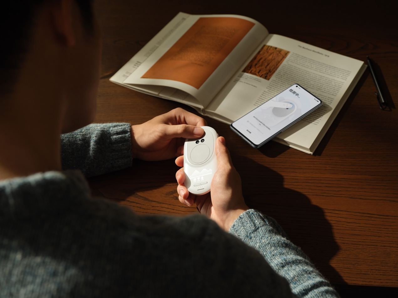 外觀設(shè)計(jì)上,H1 整體采用了溫暖弧線設(shè)計(jì),形態(tài)簡(jiǎn)約圓潤,尺寸與小號(hào)鼠標(biāo)相當(dāng),使用起來就像一塊璞玉握在手心。平時(shí)可以靜置于同樣精致簡(jiǎn)約的磁吸充電底座上,大眾認(rèn)知中龐大復(fù)雜的健康管理設(shè)備,在今天變成一個(gè)融入日常的精美“居家小物件”。