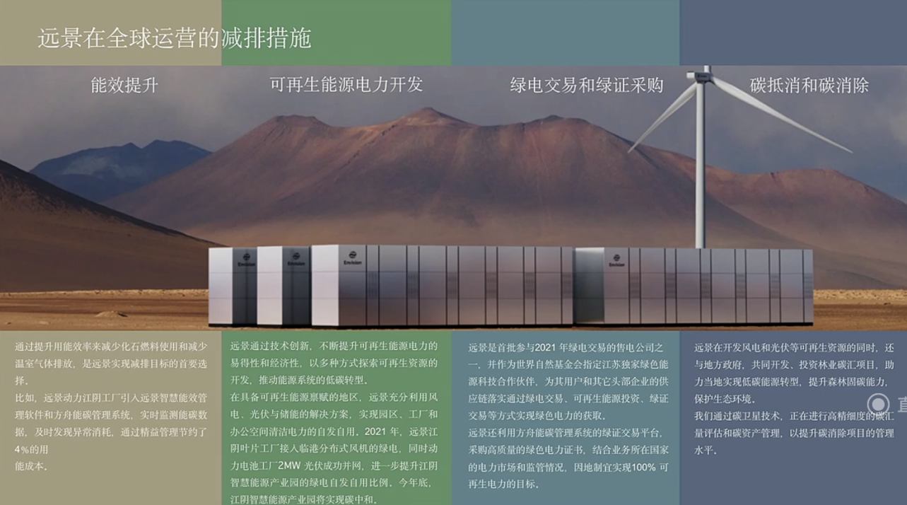 遠景科技集團電力和環(huán)境產(chǎn)品交易與供應負責人陳帝澎先生表示,遠景為自己設立了具有挑戰(zhàn)的碳中和目標——2022年實現(xiàn)運營碳中和,2028年實現(xiàn)全價值鏈的碳中和。遠景是中國內地首個承諾2025年實現(xiàn)100%綠色電力消費的企業(yè),也是中國向世界承諾最早實現(xiàn)價值鏈碳中和的企業(yè)。