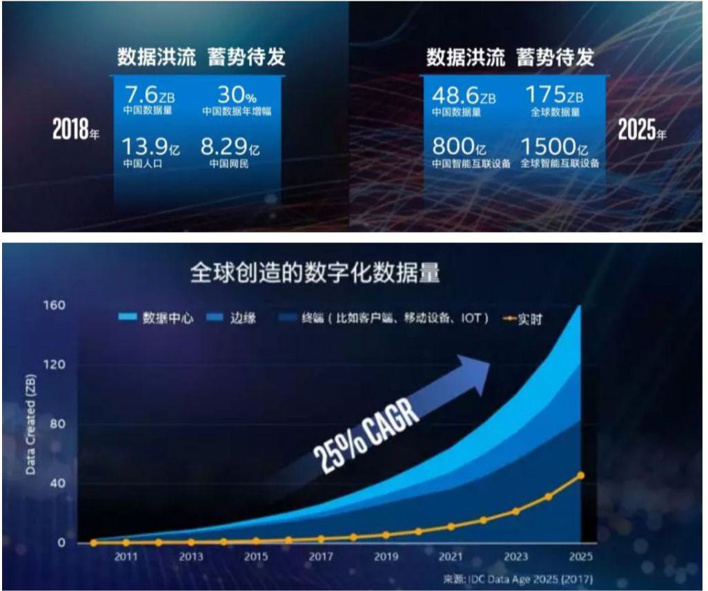 “2018年,中國約產(chǎn)生7.6ZB的數(shù)據(jù),而且還將保持每年30%的增長,到2025年的數(shù)據(jù)量將達(dá)到48.6ZB;從2015年到2025年,IDC估計(jì)全球數(shù)據(jù)量的增長平均在25%的年復(fù)合增長率?!?