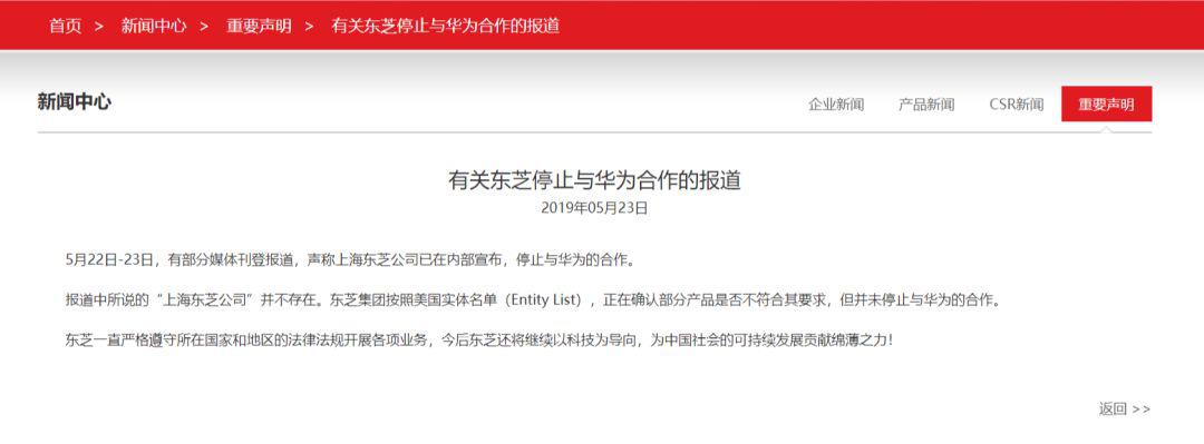 在東芝中國(guó)官網(wǎng)5月23日有一則聲明(如下),稱東芝按照美國(guó)實(shí)體名單,正在確認(rèn)部分產(chǎn)品不符合其要求,但并未停止與華為的合作。