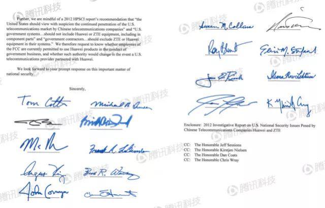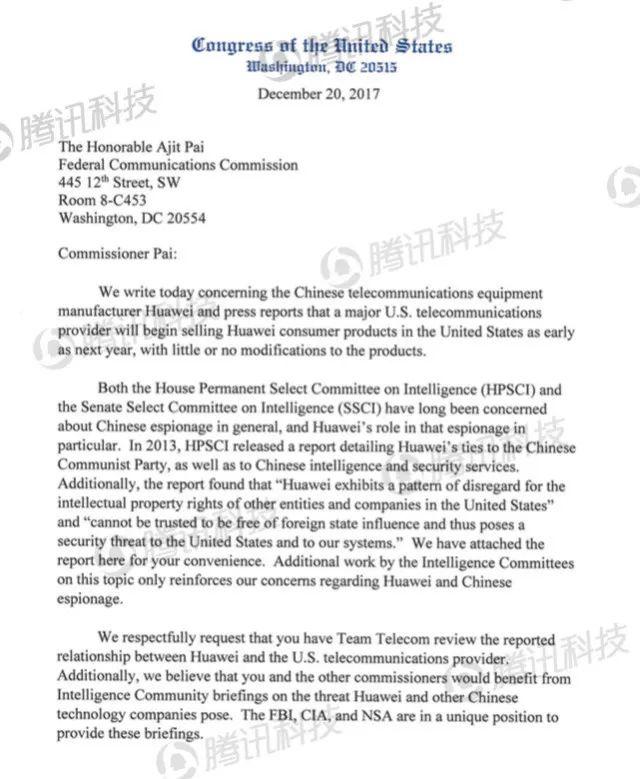 “我們需要記住2012年HPSCI報(bào)告中的建議,即“美國(guó)應(yīng)當(dāng)以懷疑的態(tài)度去評(píng)估中國(guó)電信業(yè)公司在美國(guó)電信市場(chǎng)的持續(xù)滲透”,“美國(guó)政府系統(tǒng)不應(yīng)當(dāng)加入華為或中興的設(shè)備,包括設(shè)備元件”,“政府承包商應(yīng)當(dāng)在各自系統(tǒng)中排除中興或華為的設(shè)備”。因此我們要求知道,F(xiàn)CC雇員目前是否被允許在政府事務(wù)中使用華為的產(chǎn)品,以及如果美國(guó)電信運(yùn)營(yíng)商與華為合作,這樣的規(guī)定是否會(huì)調(diào)整?!?