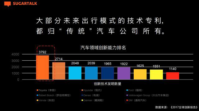 專利是通向未來(lái)的基礎(chǔ)。大家可以看一下2017年全球創(chuàng)新報(bào)告,在汽車領(lǐng)域創(chuàng)新技術(shù)發(fā)明數(shù)量方面,前10當(dāng)中有兩家不是傳統(tǒng)汽車廠商,一個(gè)是博世,另外一個(gè)是電裝,這兩家還是傳統(tǒng)的汽車零部件廠商。代表未來(lái)出行模式的技術(shù)和專利都?xì)w傳統(tǒng)汽車所有,那我想問(wèn),“野蠻人”講顛覆,其邏輯在哪里?如果只是靠吹牛,那最后可能就是下一個(gè)賈躍亭。