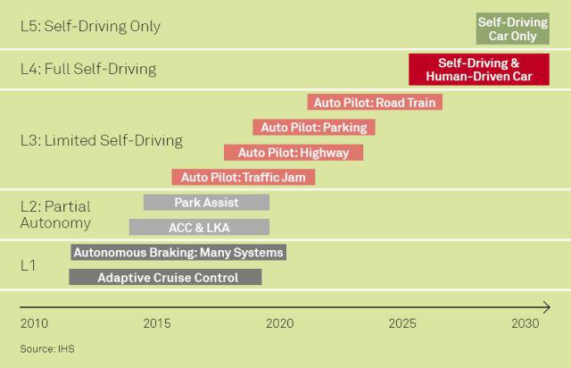 傳統(tǒng)汽車(chē)廠商大多準(zhǔn)備采取循序漸進(jìn)方式,遵循美國(guó)汽車(chē)工程師學(xué)會(huì)(SAE)的層級(jí)劃分,從第二級(jí)逐漸到第三級(jí),最后發(fā)展到全無(wú)人駕駛。2017年推出的新款?yuàn)W迪A8,就號(hào)稱是全球第一款達(dá)到L3級(jí)別的量產(chǎn)汽車(chē)。傳統(tǒng)車(chē)廠的另一個(gè)方向是開(kāi)發(fā)限制場(chǎng)景下的自動(dòng)駕駛技術(shù),例如戴姆勒等廠商主導(dǎo)的自動(dòng)駕駛車(chē)隊(duì)項(xiàng)目,即是針對(duì)高速貨運(yùn)場(chǎng)景開(kāi)發(fā)的自動(dòng)駕駛技術(shù)。
