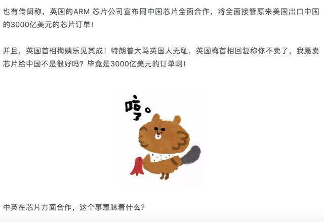 “也有傳聞稱,英國的ARM 芯片公司宣布同中國芯片全面合作,將全面接管原來美國出口中國的3000億美元的芯片訂單!