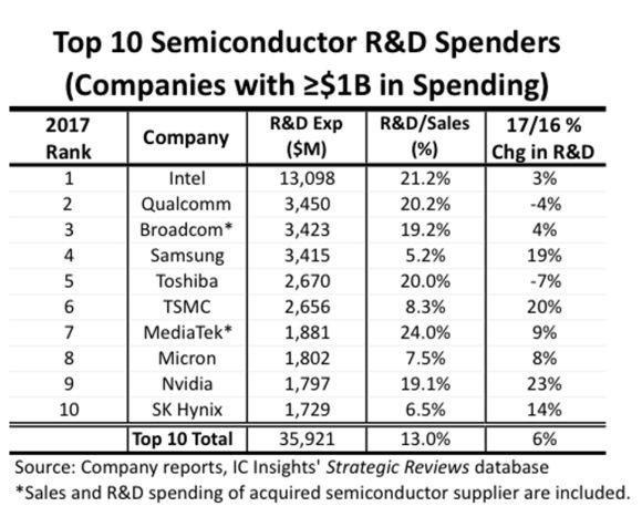 最后我們?cè)倏匆粋€(gè)數(shù)據(jù),根據(jù)IC Insights幾個(gè)月前的報(bào)告顯示,半導(dǎo)體行業(yè)在2017年研發(fā)投入共340億美元,而英特爾的研發(fā)投入則超過(guò)130億美元,比排在后面的五個(gè)競(jìng)爭(zhēng)對(duì)手高通、博通、三星、東芝和臺(tái)積電加起來(lái)還要多。所謂富二代不可怕,就怕富二代比你還努力。