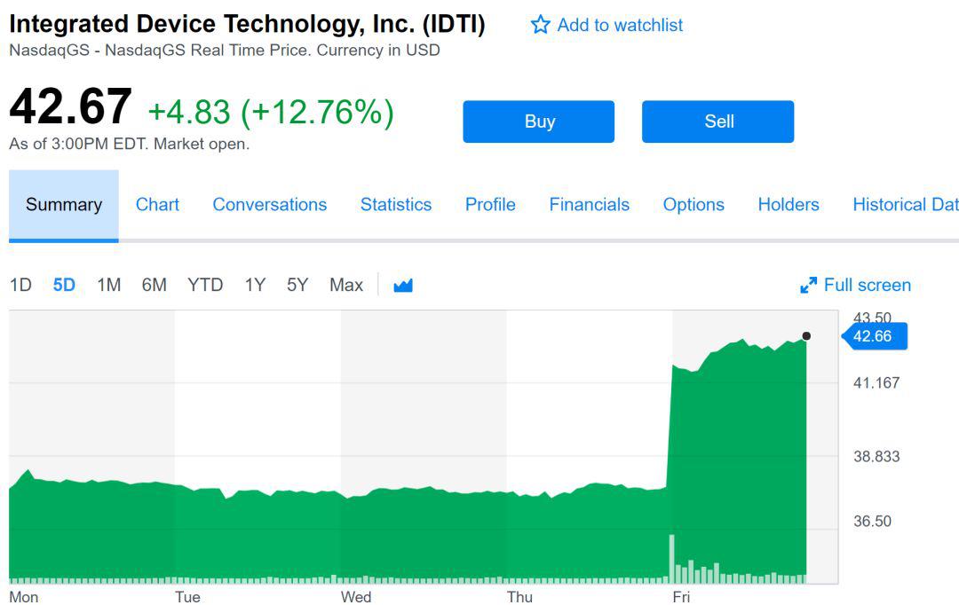 瑞薩電子對傳聞不予置評。但IDT股票在美國時間8月31日開盤后大漲10%以上,截止發(fā)稿時間漲幅為12.76%。